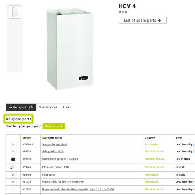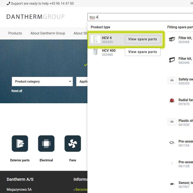 Once you have selected the right product from the list, you can see your Dantherm system and its related spare parts.